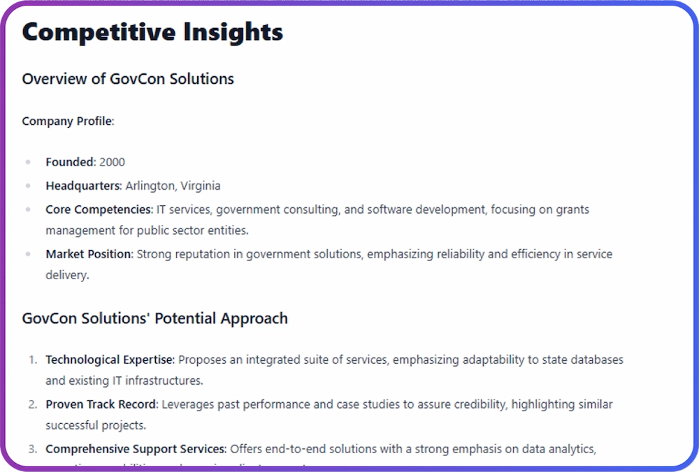 - AI stays up-to-date with all changes to GovCon best practices, including the latest DOGE requirements